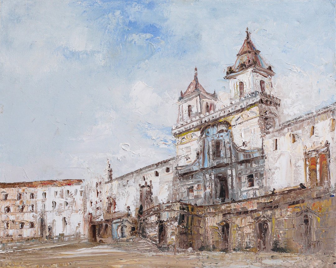 La Iglesia de San Francisco es uno de los monumentos más antiguos y reconocidos de Quito, y esta pintura transmite su esencia a través del óleo. La riqueza de detalles, la luz y los colores de la obra resaltan la belleza arquitectónica y artística del edificio.