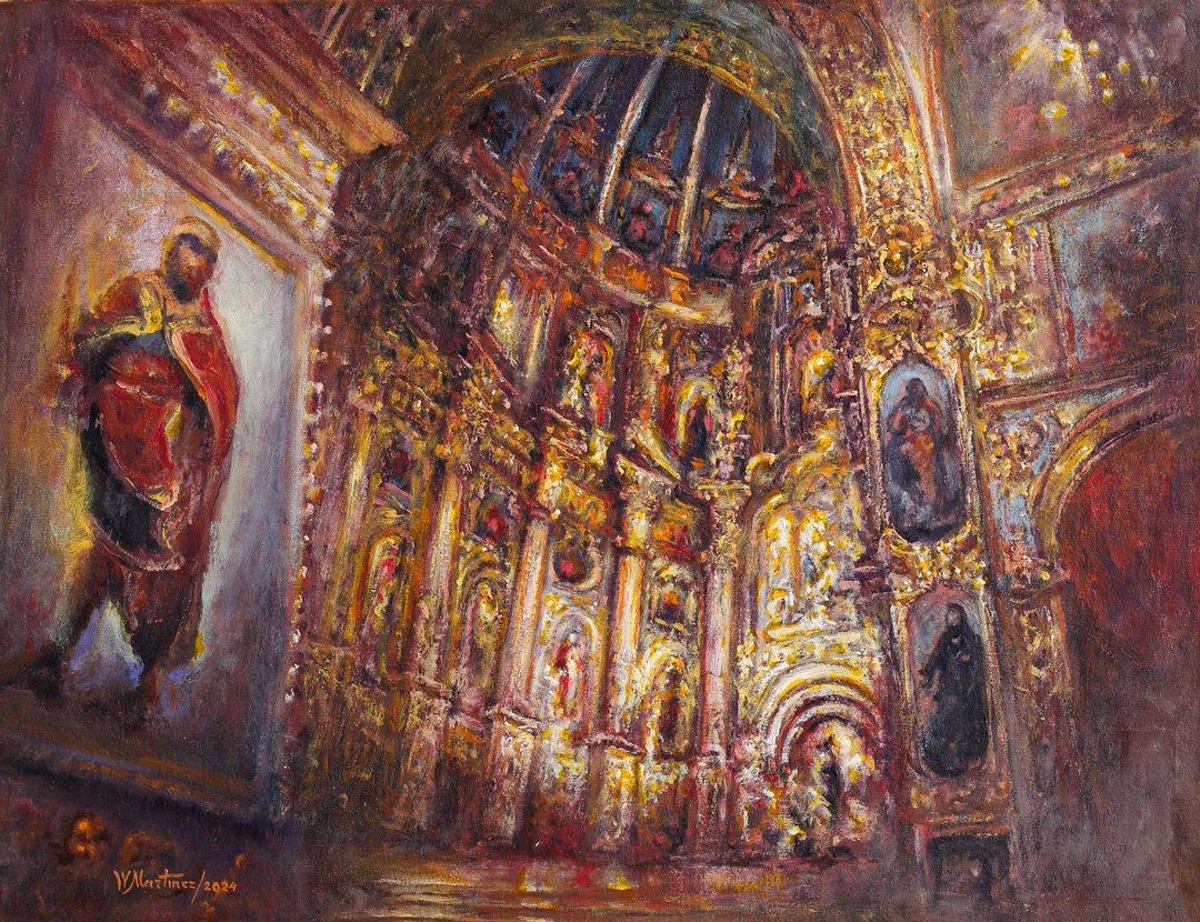 La inspiración en la Iglesia de San Francisco es evidente en la composición: columnas doradas, altares iluminados y detalles arquitectónicos que evocan el estilo barroco mestizo característico de Quito. El recurso del escorzo y la intensidad de los contrastes lumínicos generan una atmósfera sacra que envuelve al espectador, transportándolo al interior del templo.