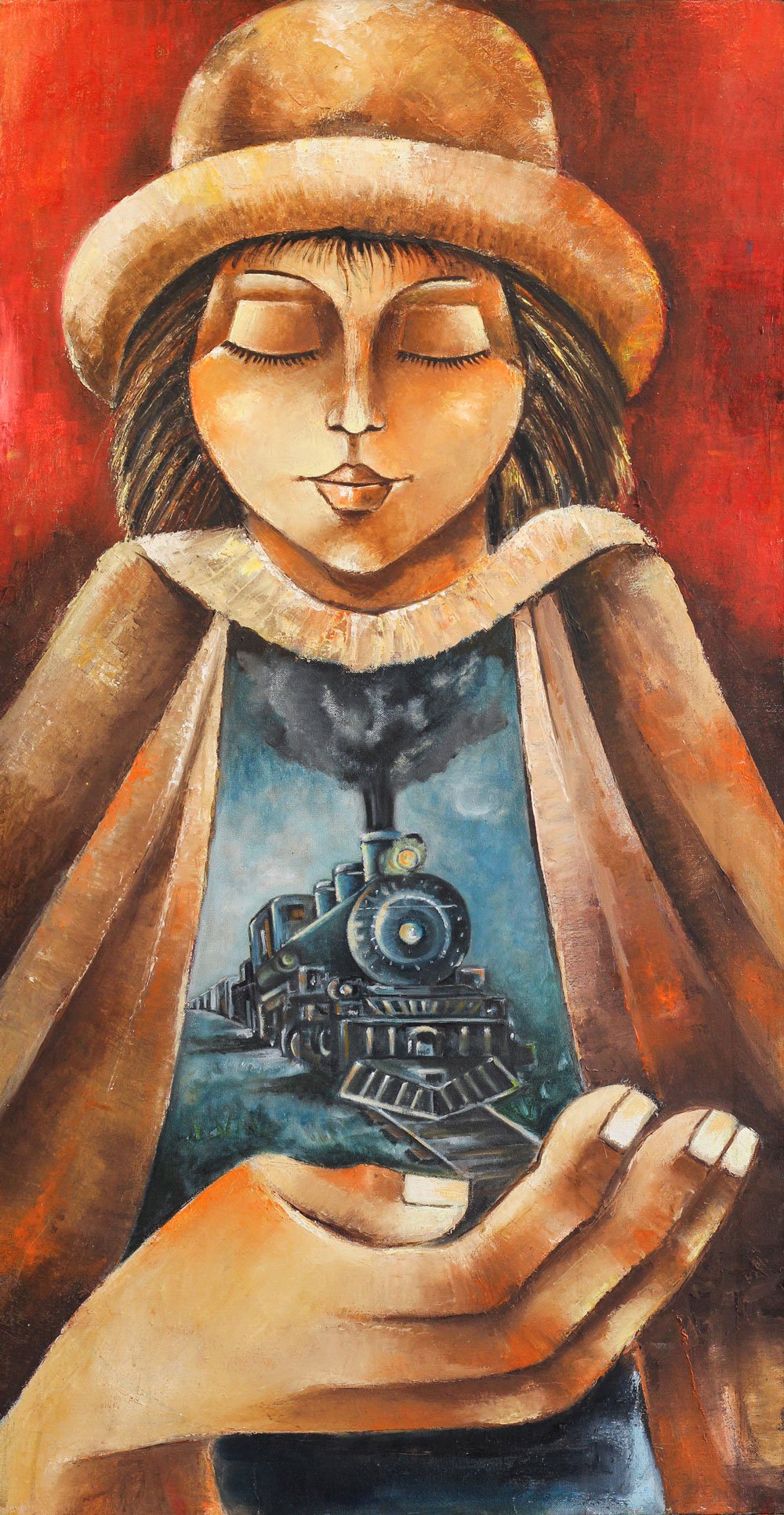 “Nuestro tren” es una pintura de tren ecuatoriano que transmite identidad, memoria y orgullo cultural. La obra presenta a una figura femenina andina, de expresión serena y ojos cerrados, como si custodiara en su interior el recuerdo vivo del ferrocarril. Entre sus manos, y en el centro de su pecho, emerge una locomotora que avanza con fuerza, envuelta en humo y energía.